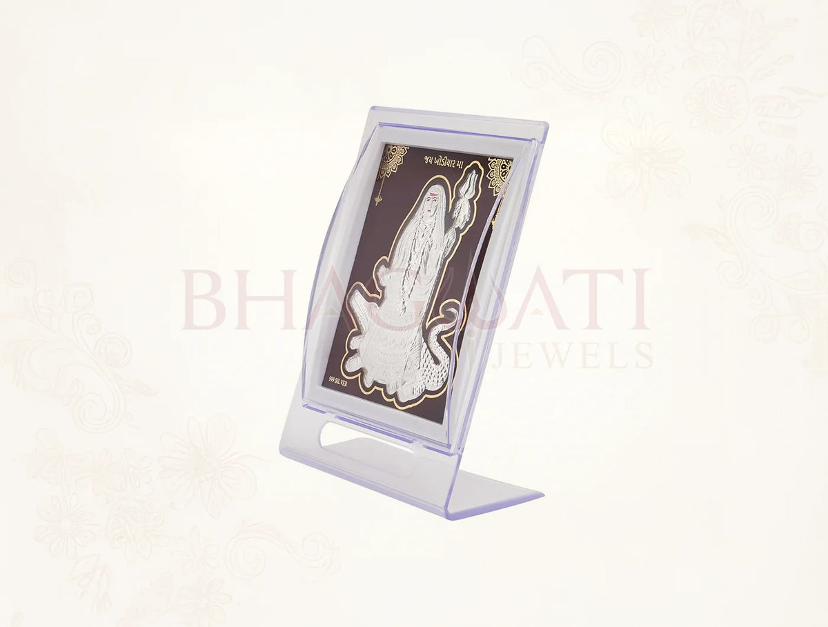 BHAGWATI JEWELS 999 Pure Silver Khodiyarmaa Stand | Divine Home Decor | Rectangle Photo stand for Gift, Acrylic Square Stand for Home, Silver Gift Items, Stand for Office Desk, Temple Decor | Tabletop Stand (7" x 5" Inch)