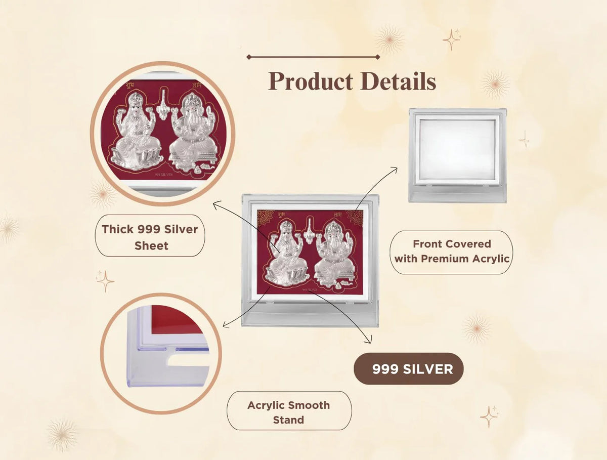 BHAGWATI JEWELS 999 Pure Silver Laxmi Ganesh Stand | Divine Home Decor | Rectangle Photo stand for Gift, Acrylic Square Stand for Home, Silver Gift Items, Stand for Office Desk, Temple Decor | Tabletop Stand (7" x 5" Inch)