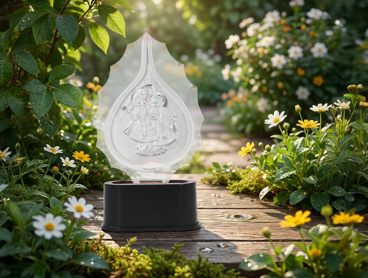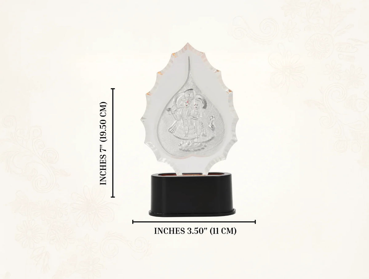 - Pure Silver (999) Radhakrishna Trophy tropDivine Blessings & Spiritual Symbolism - This Radhakrishna Trophy Stand features a beautifully sculpted Radhakrishna idol, symbolizing wisdom, prosperity, and the removal of obstacles. The design invites spiritual harmony and positive energy into any space—ideal for prayer rooms, altars, and sacred corners.hy Stand (Size :- 7 X 3.5”Inches) Back side on stand