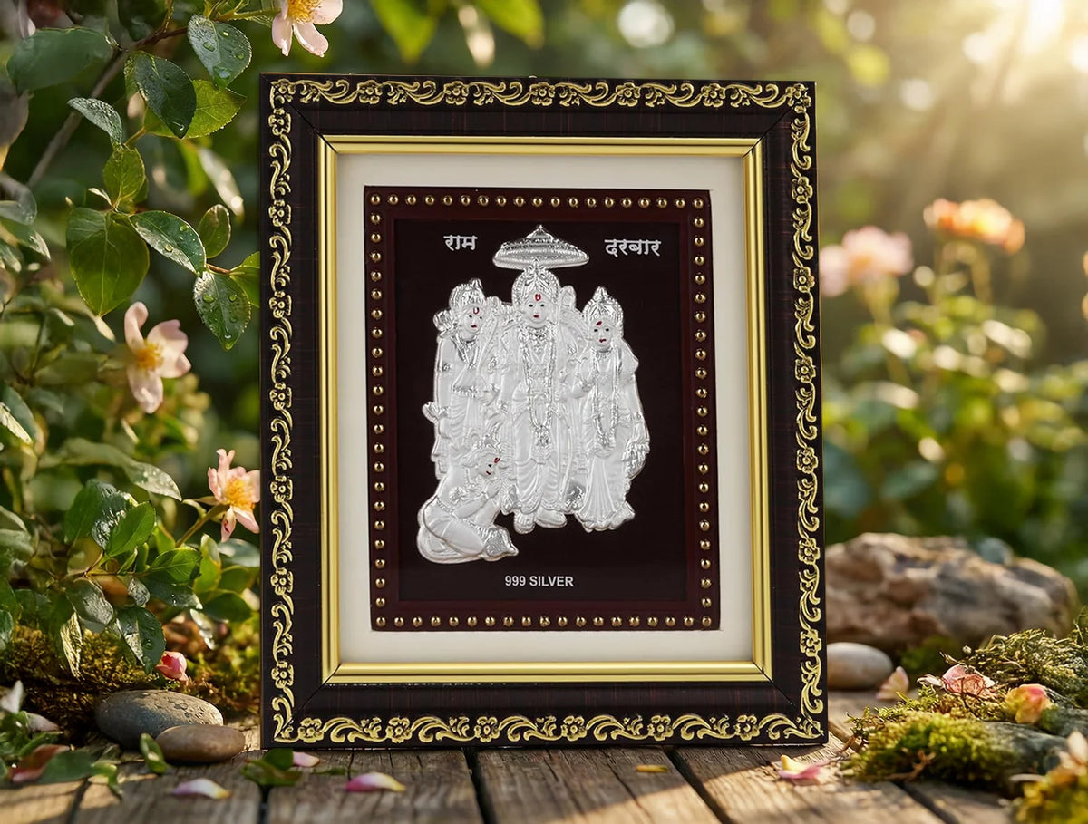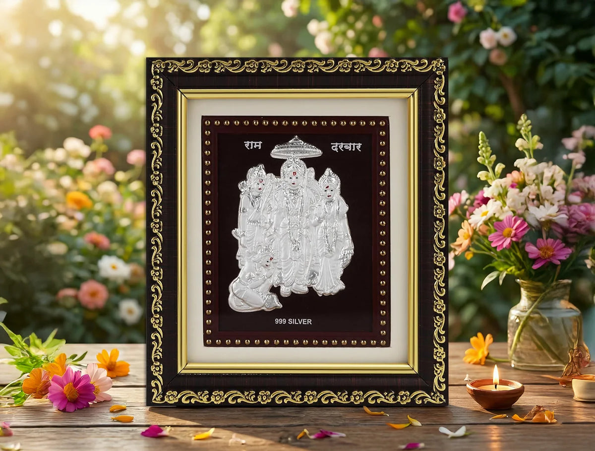 - Premium 999 Pure Silver Craftsmanship - Crafted using superior 999 pure silver, this Ramdarbar frame showcases exceptional shine and clarity, reflecting traditional Indian silver artistry at its finest. The detailing is inspired by premium handcrafted pieces found at reputed brands like Prachi Silver and Touch999, ensuring