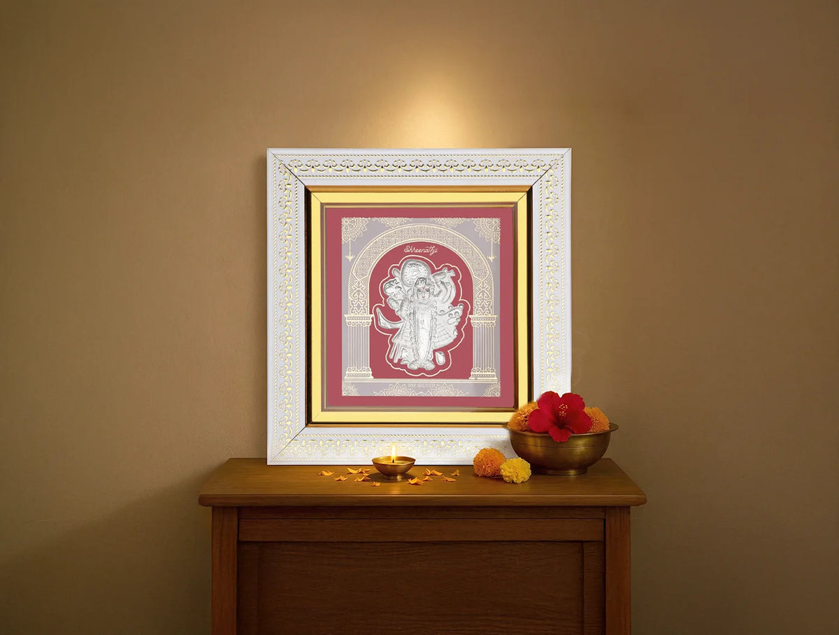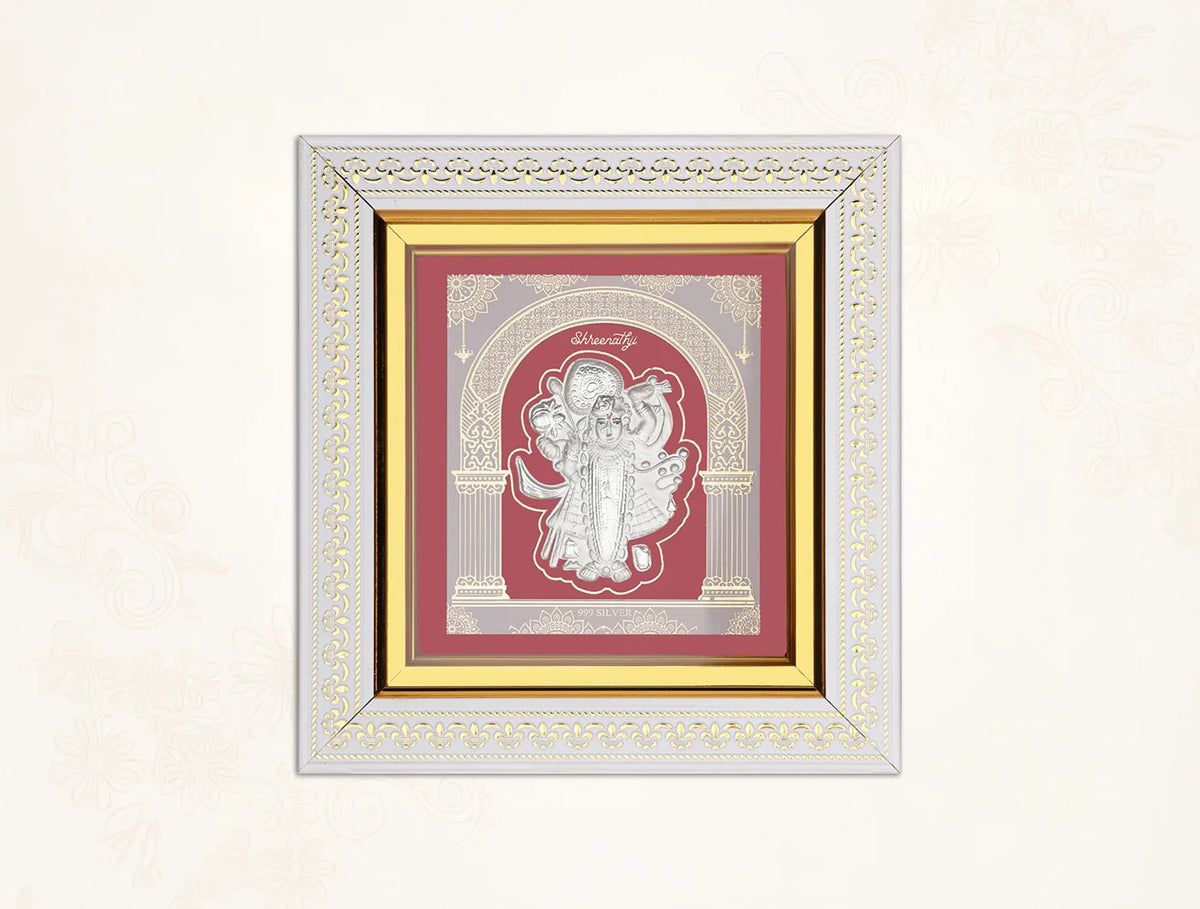 - Auspicious Shrinathji Frame for Positive Energyc -This elegant Silver shrinathji Photo Frame carries the divine presence of Lord Shrinathji, symbolizing wisdom, prosperity, and success. Ideal for puja rooms, work desks, temple setups, or living room décor, it adds a spiritual aura to any space.